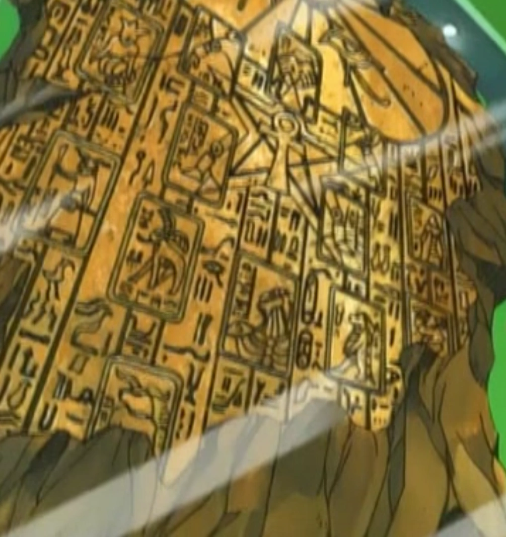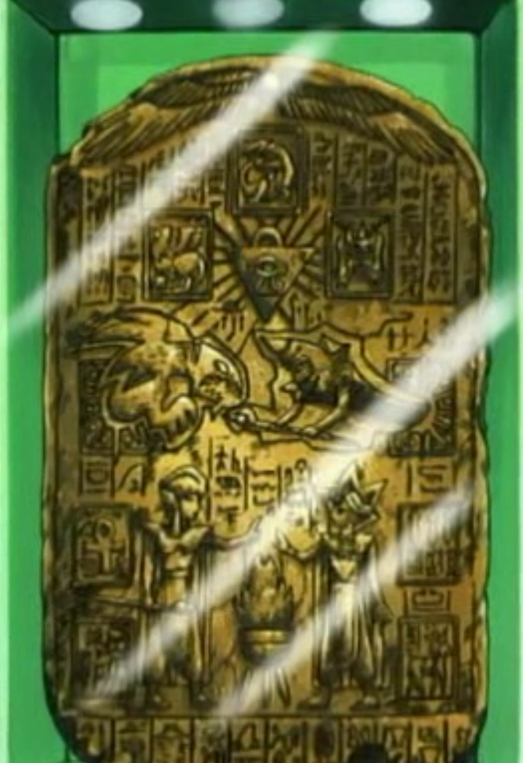 Yami Yugi bekommt eine Vision von der Steintafel, als er die drei ägyptischen Götterkarten besitzt und versucht die Worte auf Mariks Rücken zu lesen. Nach dem Battle-City-Turnier besuchen Serenity und Tea noch einmal das Museum von Domino und die Steintafel.