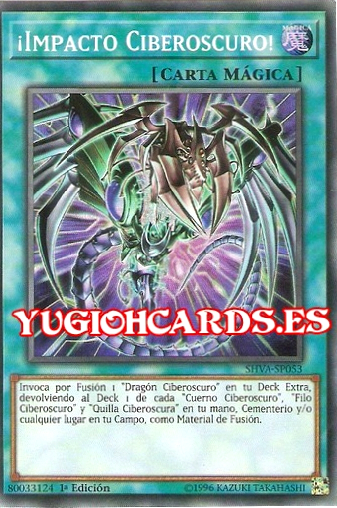 - SHVA: Invoca por Fusión 1 "Dragón Ciberoscuro" en tu Deck Extra, devolviendo al Deck 1 de cada "Cuerno Ciberoscuro", "Filo Ciberoscuro" y "Quilla Ciberoscura" en tu mano, Cementerio y/o cualquier lugar en tu Campo, como Material de Fusión.