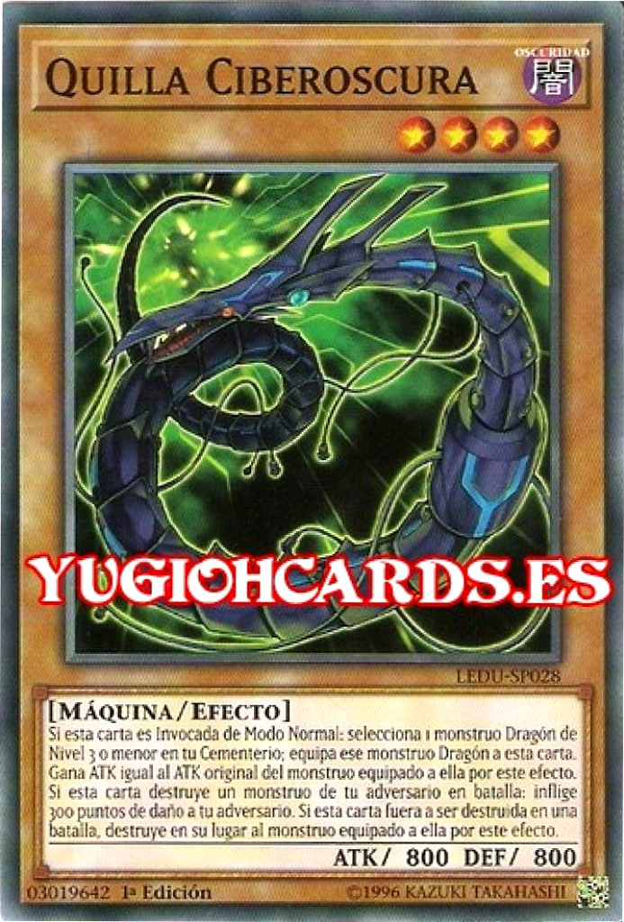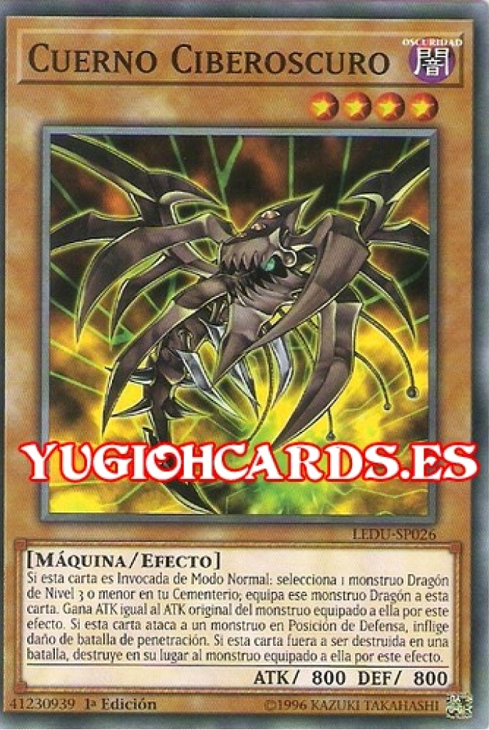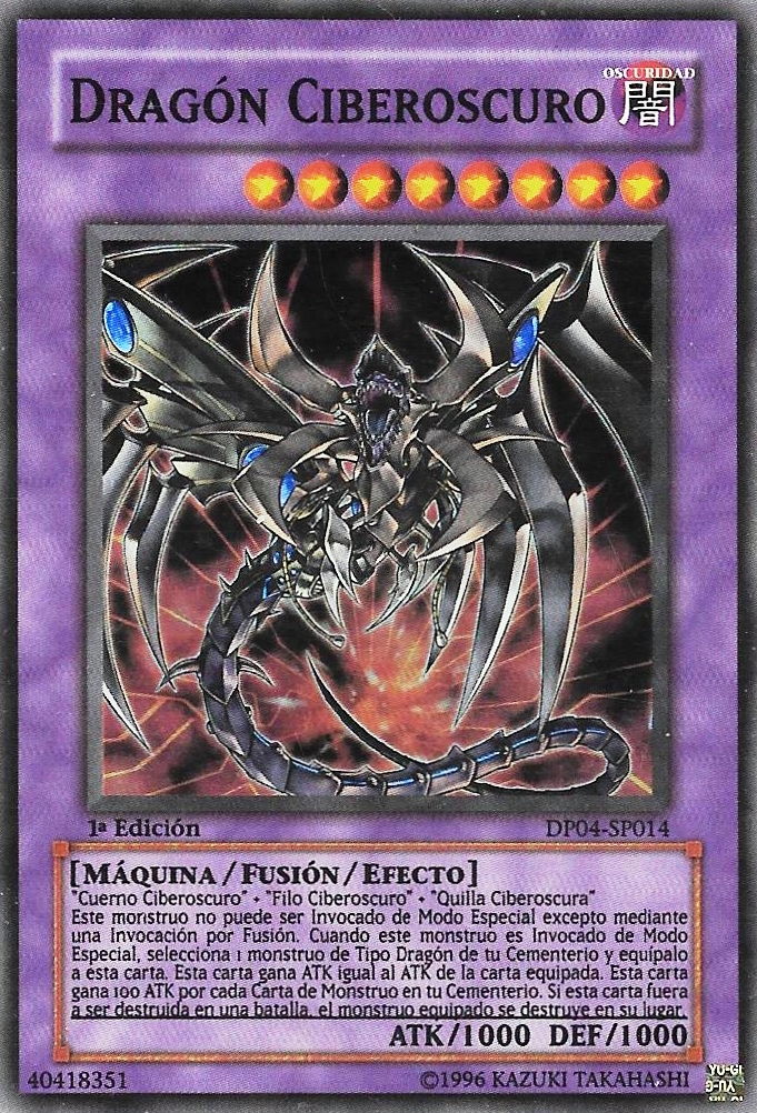 - LDS1/SDCS/SGX1: Invoca por Fusión, desde tu Deck Extra, 1 "Dragón Ciberoscuro", barajando al Deck 1 de cada "Cuerno Ciberoscuro", "Filo Ciberoscuro" y "Quilla Ciberoscura" en tu mano, Campo y/o Cementerio, como Material de Fusión.