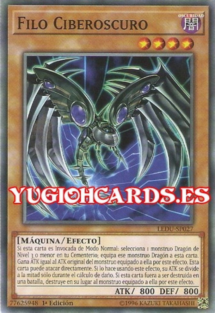 - TAEV: Devuelve 1 "Cuerno Ciberoscuro", 1 "Filo Ciberoscuro" y 1 "Quilla Ciberoscura" de tu Campo, mano o Cementerio a tu Deck. Invoca de Modo Especial 1 "Dragón Ciberoscuro" de tu Deck Extra. (Esta Invocación Especial se trata como una Invocación por Fusión).