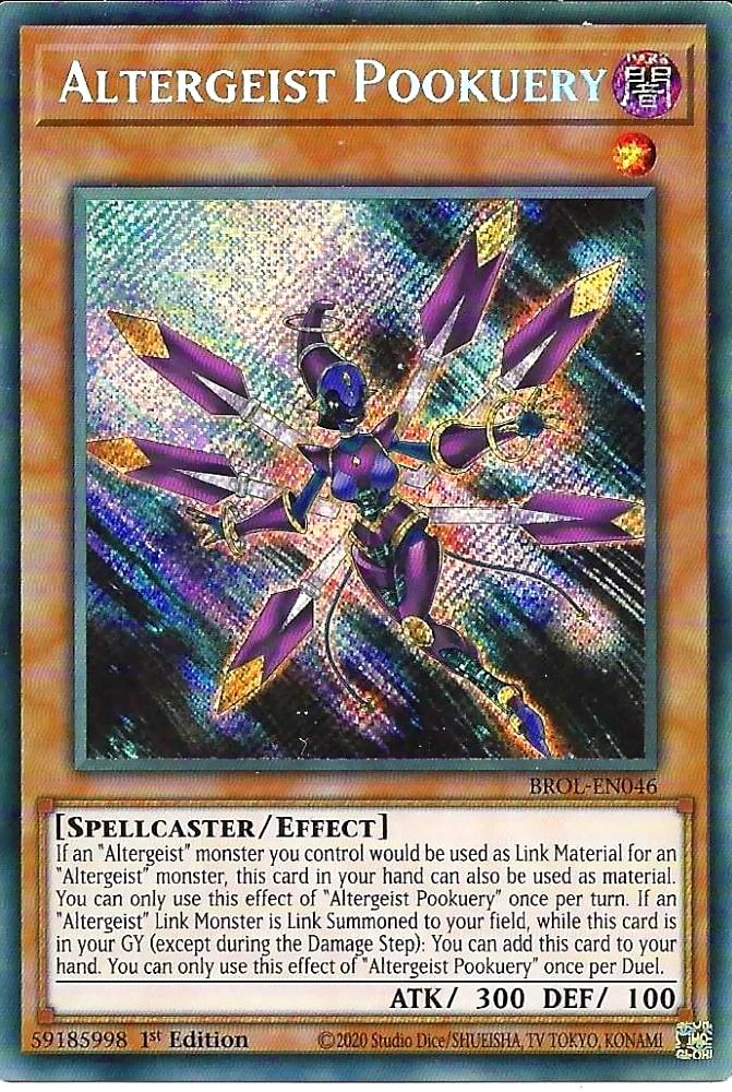 Si un monstruo "Altergeist" que controlas fuera a ser usado como Material de Enlace para un monstruo "Altergeist", esta carta en tu mano también puede ser usada como material. Sólo puedes usar este efecto de "Altergeist Pookuery" una vez por turno. Si un Monstruo de Enlace "Altergeist" es Invocado por Enlace a tu Campo, mientras esta carta está en tu Cementerio (excepto durante el Damage Step): puedes añadir esta carta a tu mano. Sólo puedes usar este efecto de "Altergeist Pookuery" una vez por Duelo.
