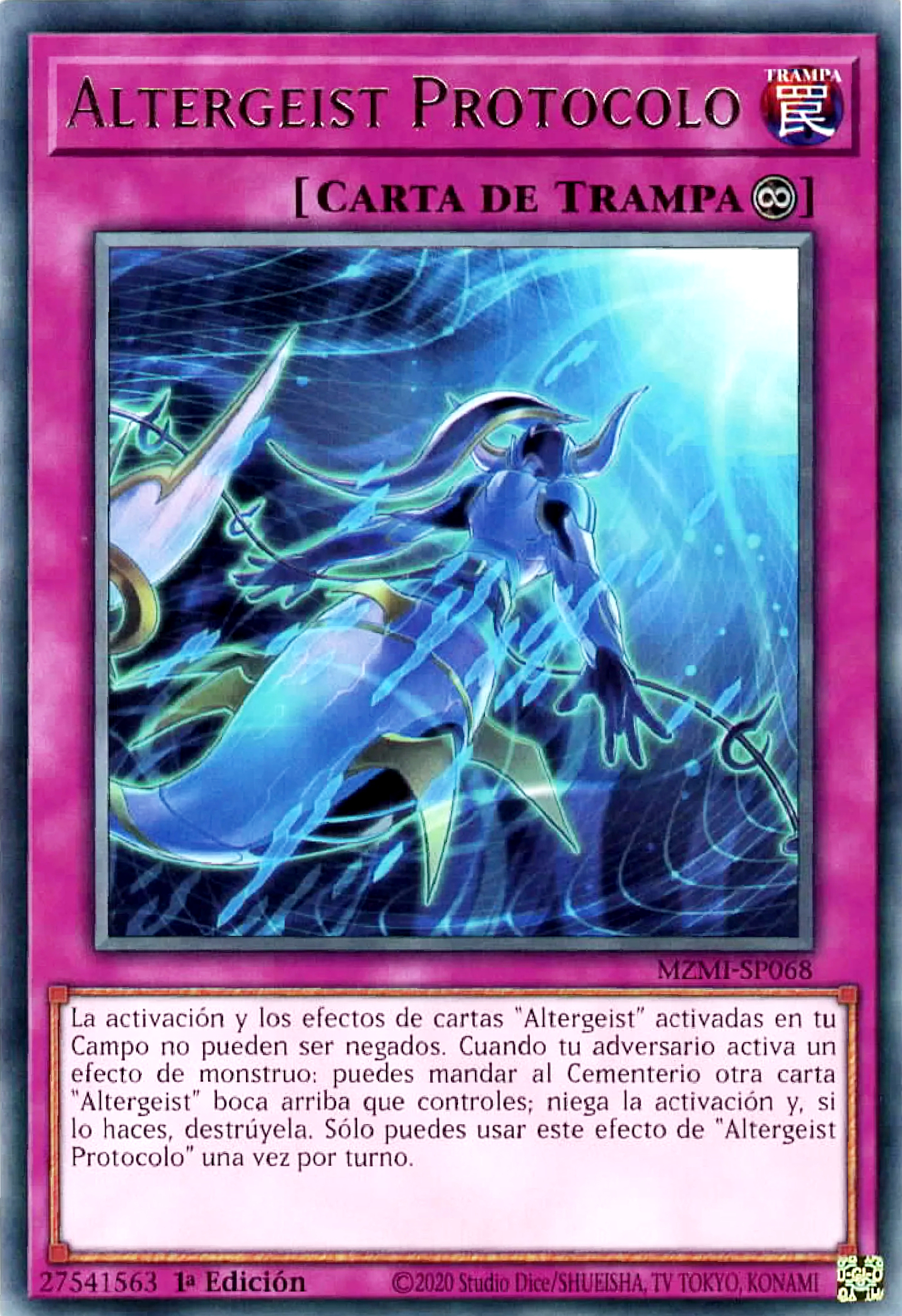- CIRB/SP18/MP18: La activación y los efectos de cartas "Altergeist" activadas en tu Campo no pueden ser negados. Cuando tu adversario activa el efecto de un monstruo: puedes mandar al Cementerio otra carta "Altergeist" boca arriba que controles; niega la activación y, si lo haces, destrúyela. Sólo puedes usar este efecto de "Altergeist Protocolo" una vez por turno.