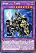 Si esta carta es Invocada por Fusión: puedes seleccionar 1 monstruo de LUZ u OSCURIDAD en tu Cementerio; Invócalo de Modo Especial. Puedes Sacrificar 1 monstruo de LUZ y 1 de OSCURIDAD; destierra todos los monstruos que controle tu adversario. Si esta carta Invocada por Fusión es destruida en batalla o por el efecto de una carta: puedes seleccionar 1 Mágica en tu Cementerio; añádela a tu mano. Sólo puedes usar cada efecto de "Amo del Caos" una vez por turno.