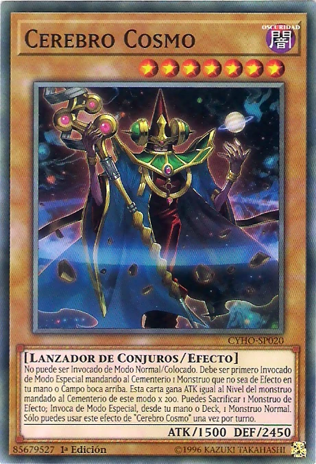 No puede ser Invocado de Modo Normal/Colocado. Debe ser primero Invocado de Modo Especial mandando al Cementerio 1 Monstruo que no sea de Efecto en tu mano o Campo boca arriba. Esta carta gana ATK igual al Nivel del monstruo mandado al Cementerio de este modo x 200. Puedes Sacrificar 1 Monstruo de Efecto; Invoca de Modo Especial, desde tu mano o Deck, 1 Monstruo Normal. Sólo puedes usar este efecto de "Cerebro Cosmo" una vez por turno.