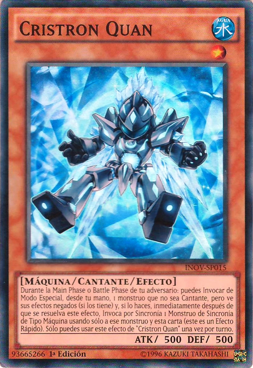 Durante la Main Phase o Battle Phase de tu adversario: puedes Invocar de Modo Especial, desde tu mano, 1 monstruo que no sea Cantante, pero ve sus efectos negados (si los tiene) y, si lo haces, inmediatamente después de que se resuelva este efecto, Invoca por Sincronía 1 Monstruo de Sincronía de Tipo Máquina usando sólo a ese monstruo y esta carta (este es un Efecto Rápido). Sólo puedes usar este efecto de "Cristron Quan" una vez por turno.