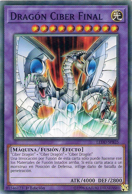 Este monstruo no puede ser Invocado mediante una Invocación Especial excepto mediante una Invocación de Fusión. Cuando este monstruo es Invocado mediante una Invocación Especial, selecciona 1 monstruo de Tipo Dragón de tu Cementerio y equípalo a esta carta. Esta carta gana ATK igual al ATK de la carta equipada. Esta carta gana 100 ATK por cada Carta de Monstruo en tu Cementerio. Si esta carta fuera a ser destruida en una batalla, el monstruo equipado se destruye en su lugar. - LDS1/SDCS/SGX1: "Cuerno Ciberoscuro" + "Filo Ciberoscuro" + "Quilla Ciberoscura"