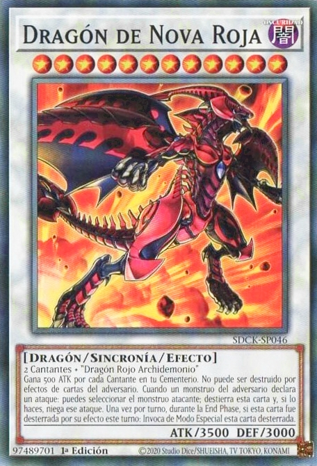 - "Dragón de Nova Roja" gana 500 ATK por cada Monstruo Cantante en tu Cementerio (por lo que su ATK inicial será de al menos 5000, ya que habrá normalmente un Monstruo Cantante por la Invocación de "Dragón Rojo Archidemonio" y dos más por la Invocación de "Dragón de Nova Roja", a menos que alguna carta haya retirado alguno de estos del Cementerio).