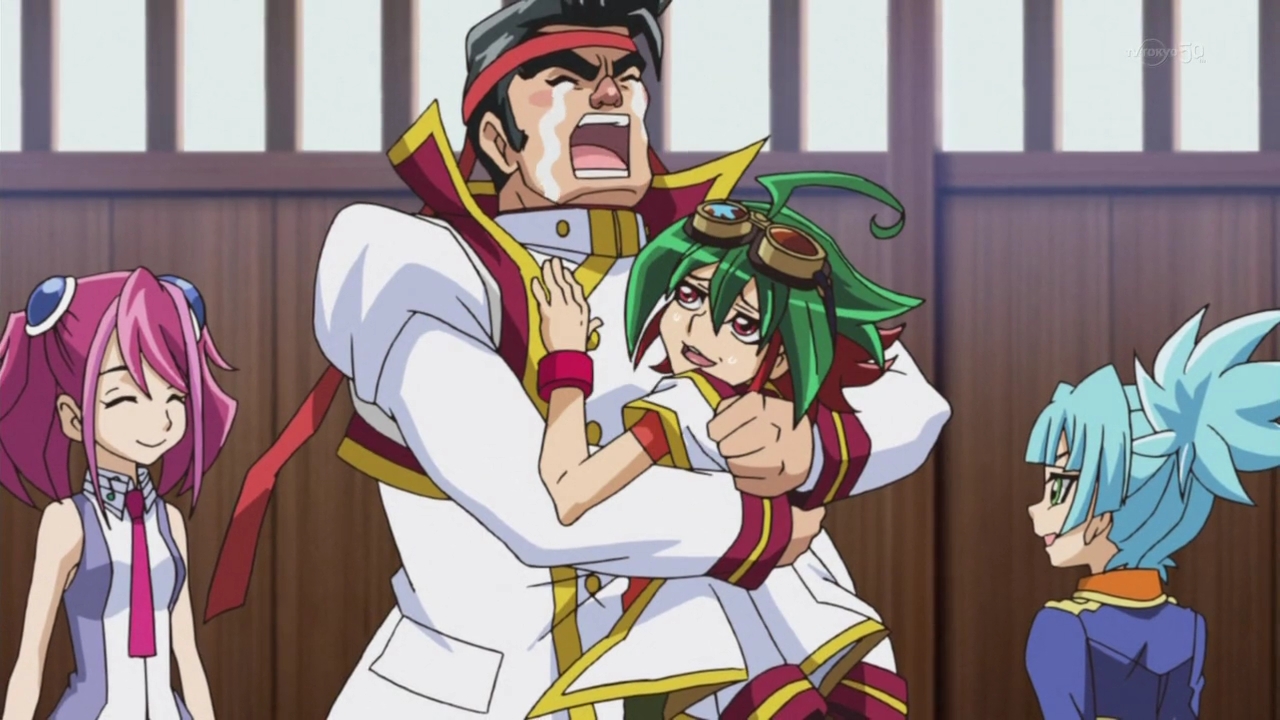 Gong, Sylvio y Aura celebrando la victoria de Yuya contra Jack