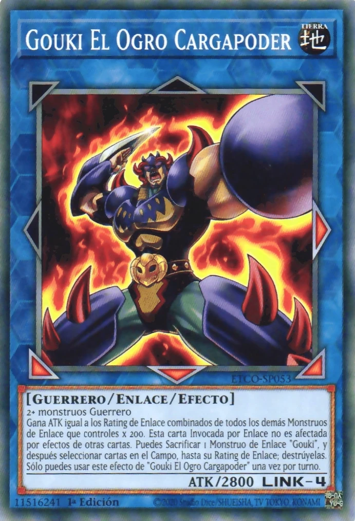 Gana ATK igual a los Rating de Enlace combinados de todos los demás Monstruos de Enlace que controles x 200. Esta carta Invocada por Enlace no es afectada por efectos de otras cartas. Puedes Sacrificar 1 Monstruo de Enlace "Gouki", y después seleccionar cartas en el Campo, hasta su Rating de Enlace; destrúyelas. Sólo puedes usar este efecto de "Gouki El Ogro Cargapoder" una vez por turno.