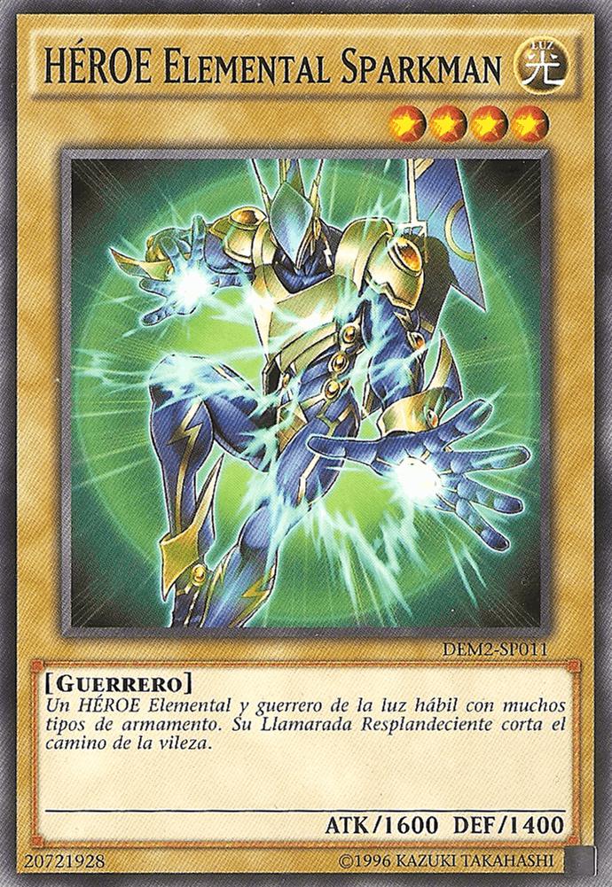 Debe ser Invocado por Fusión. Gana 300 ATK por cada carta "HÉROE Elemental" en tu Cementerio. Si esta carta destruye un monstruo en batalla y lo manda al Cementerio: inflige daño a tu adversario igual al ATK original en el Cementerio de ese monstruo. - HAC1/SGX3/BLC1: "HÉROE Elemental de la Llama Wingman" + "HÉROE Elemental Sparkman"