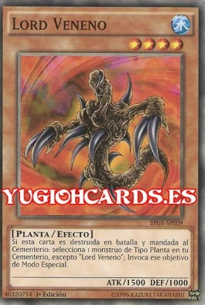 - BP03/IOC (Edición 25º Aniversario): Si esta carta es destruida en batalla y mandada al Cementerio: selecciona 1 monstruo de Tipo Planta en tu Cementerio, excepto "Lord Veneno"; Invoca ese objetivo de Modo Especial.
