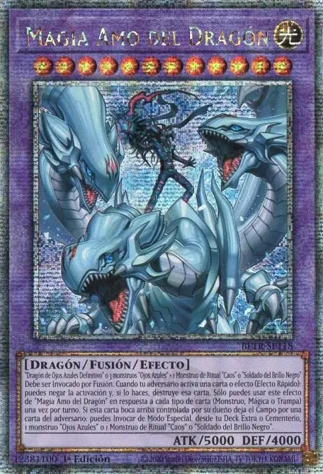 Debe ser Invocado por Fusión. Cuando tu adversario activa una carta o efecto (Efecto Rápido): puedes negar la activación y, si lo haces, destruye esa carta. Sólo puedes usar este efecto de "Magia Amo del Dragón" en respuesta a cada tipo de carta (Monstruo, Mágica o Trampa) una vez por turno. Si esta carta boca arriba controlada por su dueño deja el Campo por una carta del adversario: puedes Invocar de Modo Especial, desde tu Deck Extra o Cementerio, 1 monstruo "Ojos Azules" o 1 Monstruo de Ritual "Caos" o "Soldado del Brillo Negro".