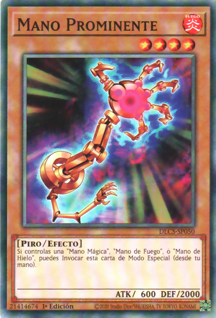 - DLCS: Cuando esta carta en tu posesión es destruida por una carta de tu adversario y mandada a tu Cementerio: puedes seleccionar 1 Mágica/Trampa que controle tu adversario; destruye ese objetivo, y después puedes Invocar de Modo Especial, desde tu Deck, 1 "Mano de Fuego".