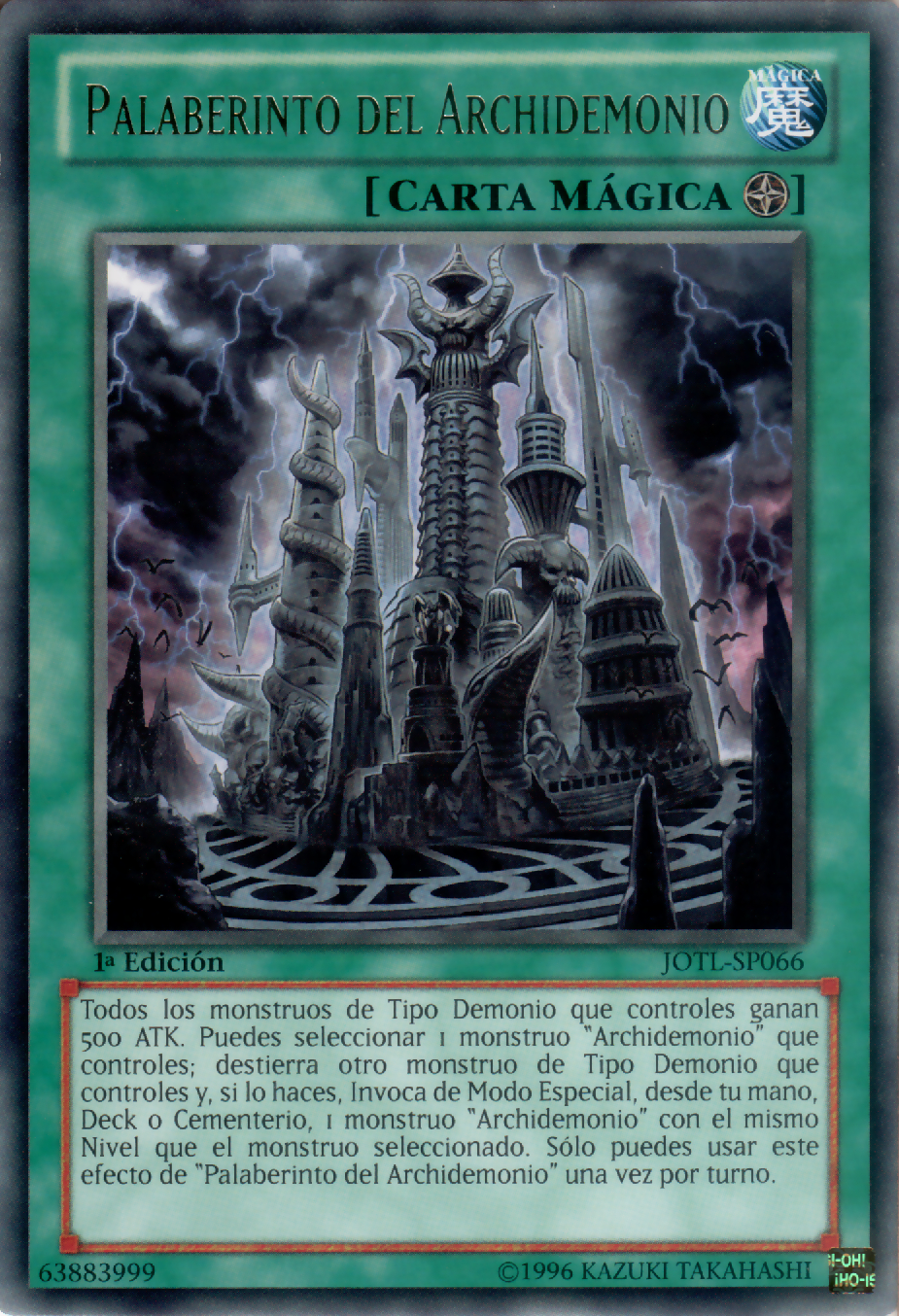 - JOTL/MP14: Todos los monstruos de Tipo Demonio que controles ganan 500 ATK. Puedes seleccionar 1 monstruo "Archidemonio" que controles; destierra otro monstruo de Tipo Demonio que controles y, si lo haces, Invoca de Modo Especial, desde tu mano, Deck o Cementerio, 1 monstruo "Archidemonio" con el mismo Nivel que el monstruo seleccionado. Sólo puedes usar este efecto de "Palaberinto del Archidemonio" una vez por turno.