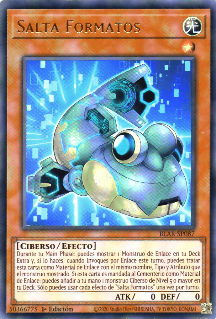 Durante tu Main Phase: puedes mostrar 1 Monstruo de Enlace en tu Deck Extra y, si lo haces, cuando Invoques por Enlace este turno, puedes tratar esta carta como Material de Enlace con el mismo nombre, Tipo y Atributo que el monstruo mostrado. Si esta carta es mandada al Cementerio como Material de Enlace: puedes añadir a tu mano 1 monstruo Ciberso de Nivel 5 o mayor en tu Deck. Sólo puedes usar cada efecto de "Salta Formatos" una vez por turno.