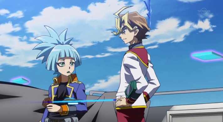 Sylvio y Zuzu observan cómo los soldados de la Academia abandonan su Duelo al distraerse con el Duelo de Yuya e Iggy.