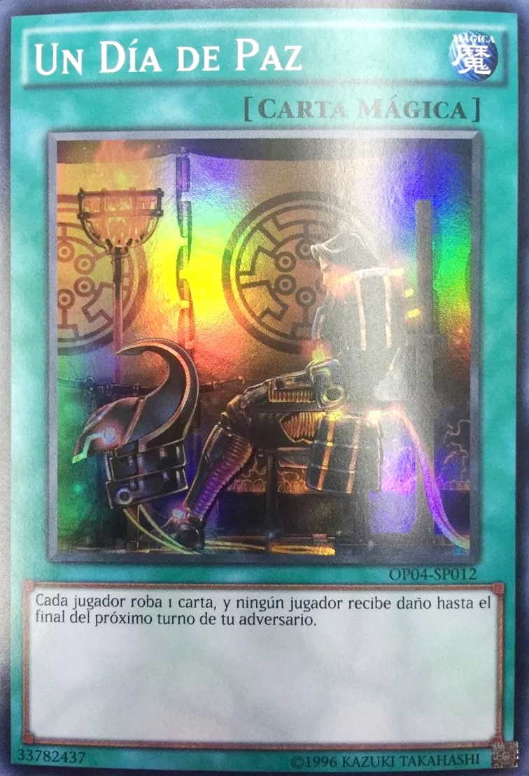 - La ilustración de "Un Día de Paz" muestra al monstruo "Seis Samuráis Legendarios - Kizan" y el símbolo de los "Seis Samuráis".