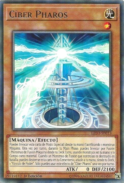 - LED3/OP17: Invoca por Fusión 1 Monstruo de Fusión Máquina en tu Deck Extra, usando monstruos en tu mano o Campo como Material de Fusión, y éste gana ATK igual a su ATK original. Durante la End Phase del turno en el que esta carta es activada, recibes daño igual a la cantidad de ATK ganado por este efecto en el momento de la Invocación.