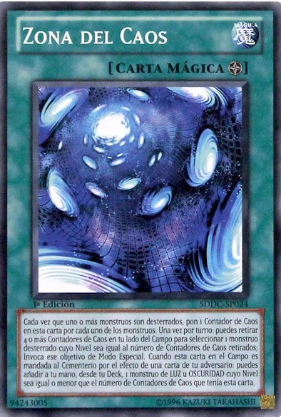- Si "Zona del Caos" es destruida por un efecto de tu adversario, puedes añadir a tu mano desde tu Deck Principal un monstruo de Atributo LUZ u OSCURIDAD con un Nivel igual a la cantidad de Contadores de Caos que tenía en ese momento. No puedes activar este efecto si "Zona del Caos" no tenía ningún contador.