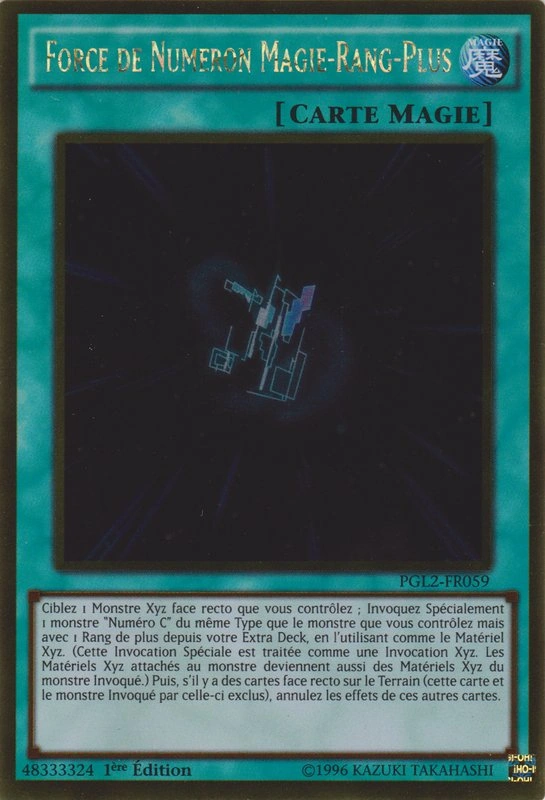 | Ciblez 1 Monstre Xyz face recto que vous contrôlez ; Invoquez Spécialement 1 monstre "Numéro C" du même Type que le monstre que vous contrôlez mais avec 1 Rang de plus depuis votre Extra Deck, en l'utilisant comme le Matériel Xyz. (Cette Invocation Spéciale est traitée comme une Invocation Xyz. Les Matériels Xyz attachés au monstre deviennent aussi des Matériels Xyz du monstre Invoqué.) Puis, s'il y a des cartes face recto sur le Terrain (cette carte et le monstre Invoqué par celle-ci exclus), annulez les effets de ces autres cartes.