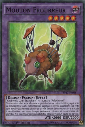 "Chaîne du Lutin Tranchant" + 1 monstre "Peluchimal" Si cette carte combat, votre adversaire ne peut ni activer de cartes ni d'effets jusqu'à la fin de la Damage Step. Si cette carte est détruite au combat et envoyée au Cimetière, ou si cette carte en votre possession est détruite par un effet de carte de votre adversaire et envoyée à votre Cimetière : vous pouvez Invoquer Spécialement cette carte, et si vous le faites, elle gagne 800 ATK. Vous ne pouvez utiliser cet effet de "Mouton Frourreur" qu'une fois par tour.