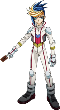Yugo a des cheveux bleu, court et des mèches jaunes tres classe à l'avant de la tête, il porte une combinaison complète de D-Wheeler blanche, rouge, jaune et bleue.