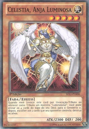 Quando você Invocar este card por Invocação-Tributo ao oferecer como Tributo um monstro "Luminoso(a)": você pode enviar os 4 cards do topo do seu Deck para o Cemitério e, depois, escolher até 2 cards que seu oponente controla; destrua os alvos.