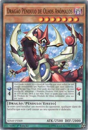 | - Efeito de Pêndulo - Você pode reduzir a 0 o dano de batalha que você sofrer de uma batalha envolvendo um Monstro Pêndulo que você controla. Durante sua Fase Final: você pode destruir este card e, se isso acontecer, adicione 1 Monstro Pêndulo com 1500 ou menos de ATK do seu Deck à sua mão. Você só pode usar cada Efeito de Pêndulo de "Dragão Pêndulo de Olhos Anômalos" uma vez por turno. - Efeito de Monstro -Se este card batalhar um monstro do oponente, qualquer dano de batalha que este card causar ao seu oponente é dobrado.