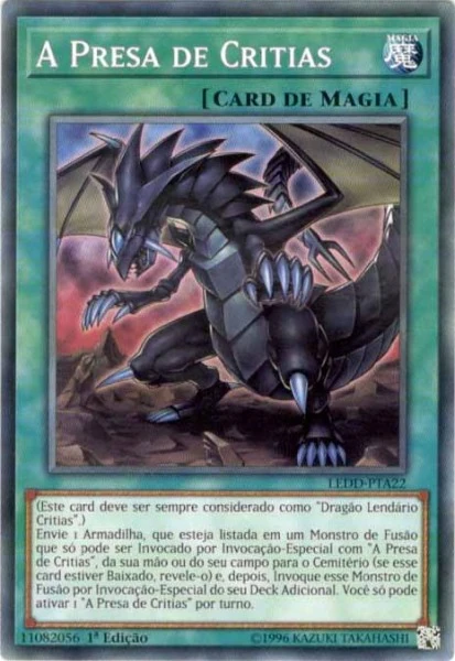 Envie 1 Card de Armadilha, que esteja listada em um Monstro de Fusão que só pode ser Invocado por Invocação-Especial com "A Presa de Critias", da sua mão ou do seu campo para o Cemitério (se esse card estiver Baixado, revele-o) e, depois, Invoque esse Monstro de Fusão por Invocação-Especial do seu Deck Adicional. Você só pode ativar 1 "A Presa de Critias" por turno. | ||