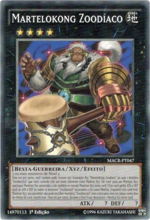 Uma vez por turno, você também pode Invocar por Invocação-Xyz "Martelokong Zoodíaco" ao usar 1 monstro "Zoodíaco(a)" que você controla com um nome diferente como Matéria Xyz. (Se você usou um Monstro Xyz, quaisquer Matérias Xyz associadas a ele também se tornam Matérias Xyz neste card.) Este card ganha ATK e DEF igual ao ATK e DEF de todos os monstros "Zoodíaco(a)" associados a ele como Matéria. Enquanto este card tiver Matérias Xyz, seu oponente não pode escolher monstros "Zoodíaco(a)" com a face para cima no campo como alvo de efeitos de card, exceto este. Uma vez por turno, durante a Fase Final: desassocie 1 Matéria Xyz deste card. | ||
