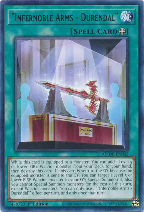 While this card is equipped to a monster: You can add 1 Level 5 or lower FIRE Warrior monster from your Deck to your hand, then destroy this card. If this card is sent to the GY because the equipped monster is sent to the GY: You can target 1 Level 5 or lower FIRE Warrior monster in your GY; Special Summon it, also you cannot Special Summon monsters for the rest of this turn, except Warrior monsters. You can only use 1 ""Infernoble Arms - Durendal"" effect per turn, and only once that turn. |
