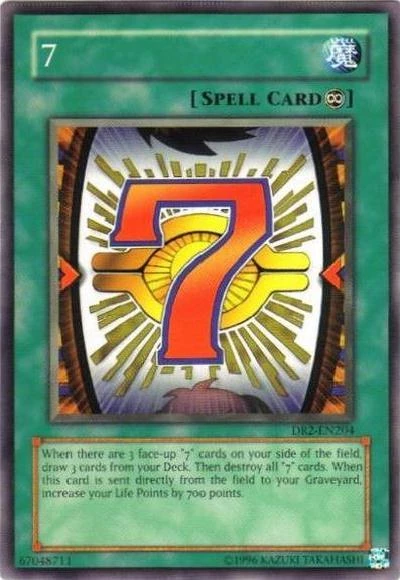 Cuando hay 3 cartas "7" boca arriba en tu Campo, roba 3 cartas de tu Deck. Destruye todas las cartas "7". Cuando esta carta es mandada del Campo al Cementario, aumenta tus Life Points en 700 puntos.