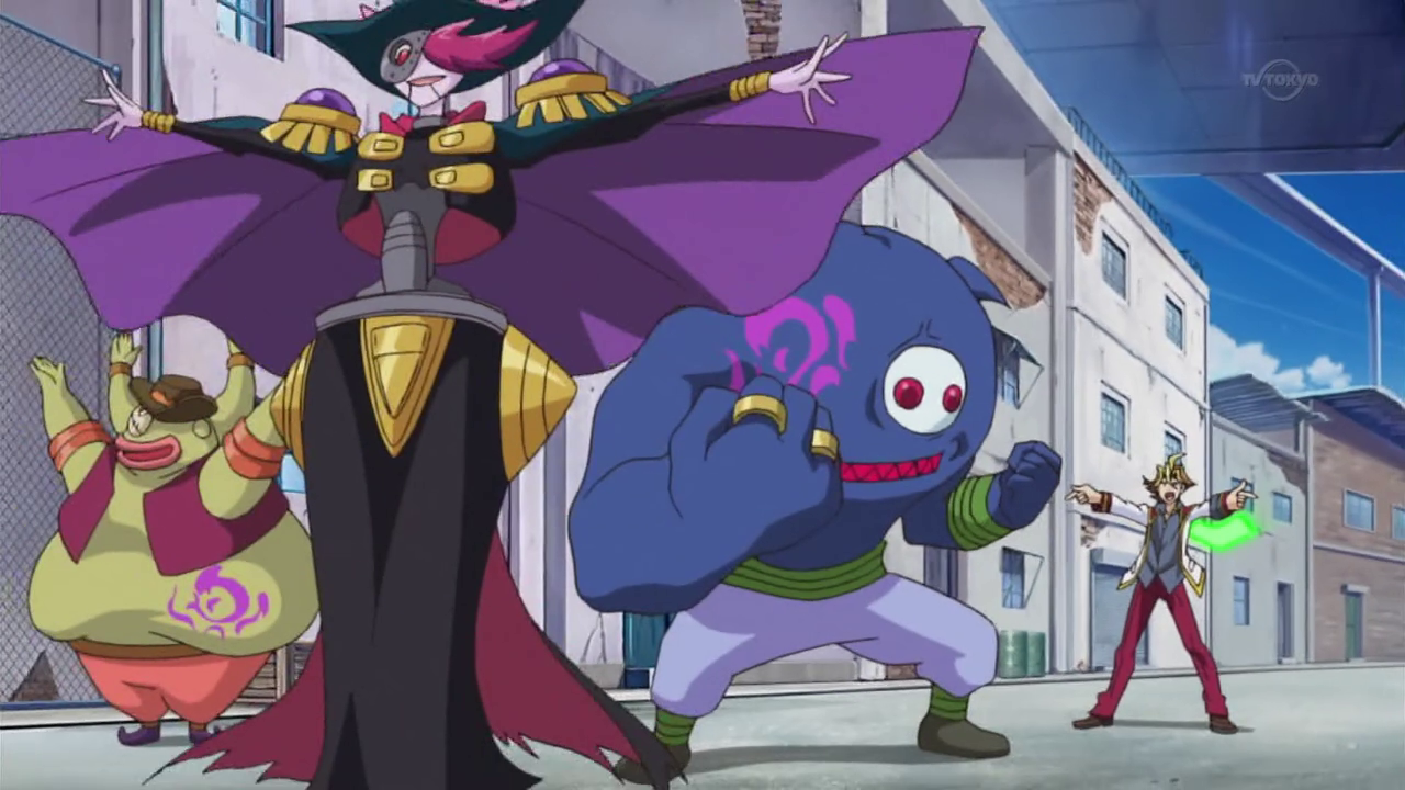 Sylvio Sawatari with "Abyss Actor - Funky Comedian", "Abyss Actor - Superstar" and "Abyss Actor - Evil Heel" in the anime.