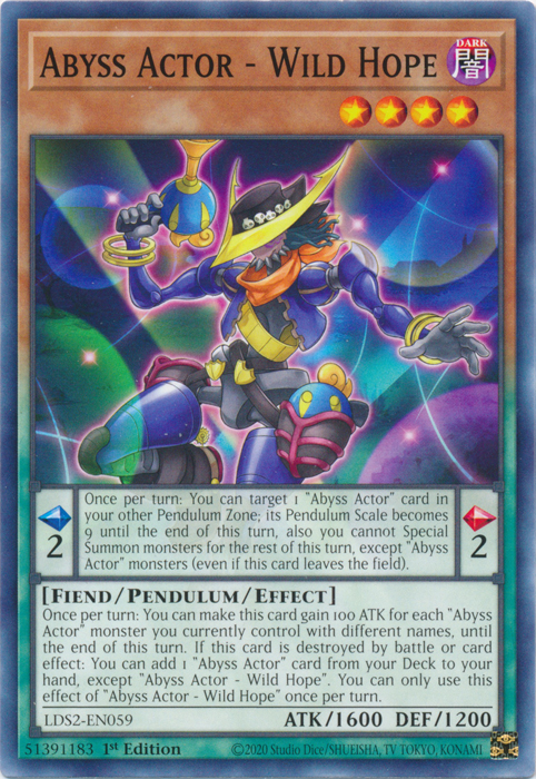 - Einmal pro Spielzug: Du kannst diese Karte bis zum Ende dieses Spielzugs 100 ATK für jedes „Abgrundschauspieler“-Monster mit unterschiedlichem Namen erhalten lassen, das du derzeit kontrollierst. Falls diese Karte durch Kampf oder einen Karteneffekt zerstört wird: Du kannst deiner Hand 1 „Abgrundschauspieler“-Karte von deinem Deck hinzufügen, außer „Abgrundschauspieler - Wilde Hoffnung“. Du kannst diesen Effekt von „Abgrundschauspieler - Wilde Hoffnung“ nur einmal pro Spielzug verwenden.