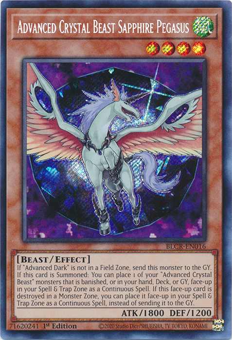 Se "Oscurità Avanzata" non è in una Zona Terreno, manda questo mostro al Cimitero. Se questa carta viene Evocata: puoi mettere 1 dei tuoi mostri "Bestia Cristallo Avanzata" che è bandito, o nella tua mano, Deck o Cimitero, scoperto nella tua Zona Magie & Trappole come una Magia Continua. Se questa carta scoperta viene distrutta in una Zona Mostri, puoi metterla scoperta nella tua Zona Magie & Trappole come una Magia Continua, invece di mandarla al Cimitero. |