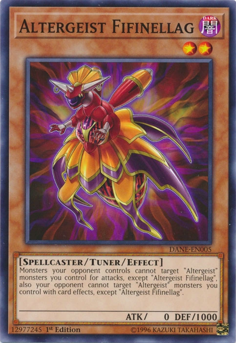 Monstros que seu oponente controla não podem escolher monstros "Altergeist" que você controla como alvo de ataques, exceto "Fifinellag Altergeist" e, além disso, seu oponente não pode escolher monstros "Altergeist" que você controla como alvo de efeitos de card, exceto "Fifinellag Altergeist". |