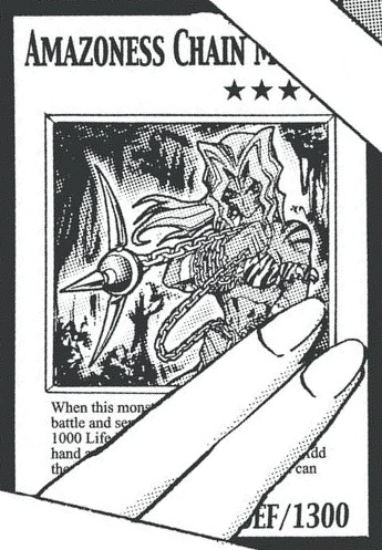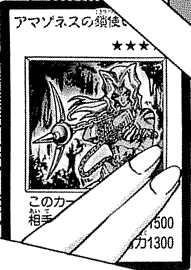 | Japanese | アマゾネスの鎖使い | このカードが攻撃表示で墓地に送られた時、1000ライフポイントを払う事で、相手のデッキからモンスターカード1枚を奪う事ができる。 |