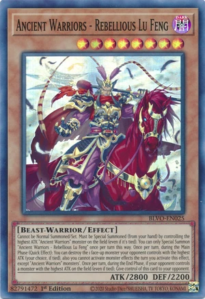No puede ser Invocado de Modo Normal/Colocado. Debe ser Invocado de Modo Especial (desde tu mano) controlando el monstruo "Antiguos Guerreros" con el ATK más alto en el Campo (aún si hay empate). Sólo puedes Invocar de Modo Especial "Antiguos Guerreros - Rebelde Lu Feng" una vez por turno de esta forma. Una vez por turno, durante la Main Phase (Efecto Rápido): puedes destruir el monstruo boca arriba que controle tu adversario con el ATK más alto (si hay empate, eliges tú), y además no puedes activar efectos de monstruos el turno en el que activas este efecto, excepto de monstruos "Antiguos Guerreros". Una vez por turno, durante la End Phase, si tu adversario controla el monstruo con el ATK más alto en el Campo (incluso si hay empate): da el control de esta carta a tu adversario. |