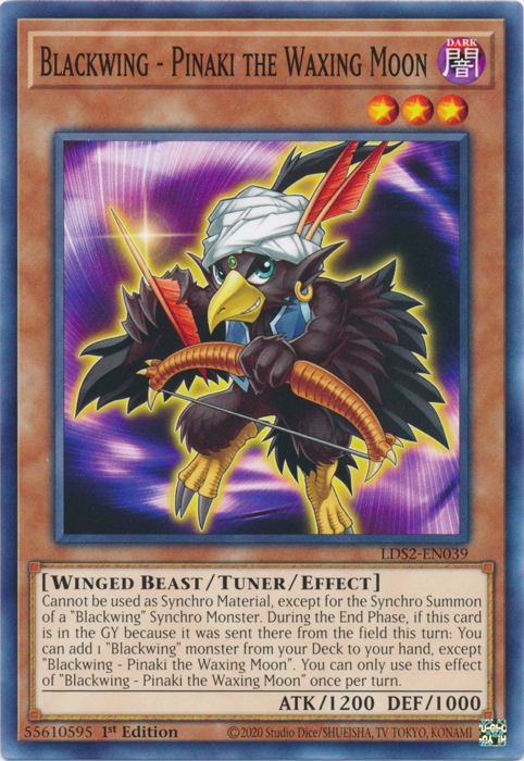 Kann nicht als Synchromaterial verwendet werden, außer für die Synchrobeschwörung eines „Schwarzflügel“-Synchromonsters. Während der End Phase, falls sich diese Karte im Friedhof befindet, weil sie in diesem Spielzug vom Spielfeld dorthin gelegt wurde: Du kannst deiner Hand 1 „Schwarzflügel“-Monster von deinem Deck hinzufügen, außer „Schwarzflügel - Pinaki der zunehmende Mond“. Du kannst diesen Effekt von „Schwarzflügel - Pinaki der zunehmende Mond“ nur einmal pro Spielzug verwenden. |