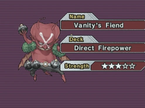 In GX Spirit Caller, he appears as a Duel Monster Spirit under the name Vanity's Fiend though this was a mistake. By beating him a few times, he can be unlocked for use by the player. He can be found at the east side of Duel Academy.
