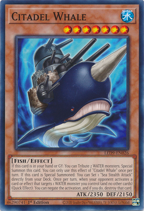 Falls sich diese Karte in deiner Hand oder deinem Friedhof befindet: Du kannst 2 WASSER Monster als Tribut anbieten; beschwöre diese Karte als Spezialbeschwörung. Du kannst diesen Effekt von „Zitadellenwal“ nur einmal pro Spielzug verwenden. Falls diese Karte als Spezialbeschwörung beschworen wird: Du kannst 1 „Heimlicher Angriff zu Wasser“ direkt von deinem Deck setzen. Einmal pro Spielzug, wenn dein Gegner eine Karte oder einen Effekt aktiviert, die oder der 1 WASSER Monster, das du kontrollierst, (und keine anderen Karten) als Ziel wählt (Schnelleffekt): Du kannst die Aktivierung annullieren und falls du dies tust, zerstöre jene Karte. |