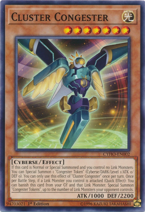 Si esta carta es Invocada de Modo Normal o Especial y no controlas Monstruos de Enlace: puedes Invocar de Modo Especial 1 "Ficha Congestionador" (Ciberso/OSCURIDAD/Nivel 1/ATK 0/DEF 0). Sólo puedes usar este efecto de "Congestionador de Clúster" una vez por turno. Una vez por Battle Step, si un Monstruo de Enlace que controlas es atacado (Efecto Rápido): puedes desterrar esta carta en tu Cementerio y ese Monstruo de Enlace; Invoca de Modo Especial tantas "Fichas Congestionador" como la cantidad de Monstruos de Enlace que controle tu adversario. |