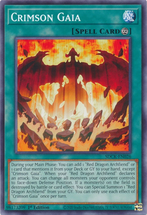 Durante tu Main Phase: puedes añadir a tu mano 1 "Dragón Rojo Archidemonio" en tu Deck o Cementerio o 1 carta que lo mencione, excepto "Gaia Carmesí". Cuando tu "Dragón Rojo Archidemonio" declara un ataque: puedes cambiar todos los monstruos que controle tu adversario a Posición de Defensa boca abajo. Si uno o más monstruos en el Campo son destruidos en batalla o por el efecto de una carta: puedes Invocar de Modo Especial, desde tu Cementerio, 1 "Dragón Rojo Archidemonio". Sólo puedes usar cada efecto de "Gaia Carmesí" una vez por turno. |