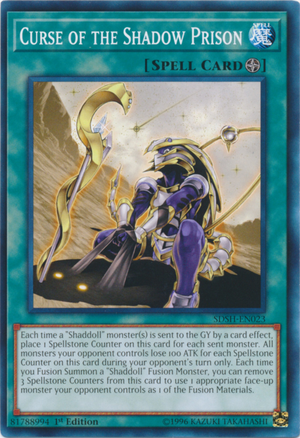 Jedes Mal, wenn ein oder mehr „Schattenpuppe“-Monster durch einen Karteneffekt auf den Friedhof gelegt werden, lege für jedes gelegte Monster 1 Zauberstein-Zählmarke auf diese Karte. Alle Monster, die dein Gegner kontrolliert, verlieren nur während des Spielzugs deines Gegners für jede Zauberstein-Zählmarke auf dieser Karte 100 ATK. Jedes Mal, wenn du ein „Schattenpuppe“-Fusionsmonster als Fusionsbeschwörung beschwörst, kannst du 3 Zauberstein-Zählmarken von dieser Karte entfernen, um 1 geeignetes offenes Monster, das dein Gegner kontrolliert, als 1 Fusionsmaterial zu verwenden. |