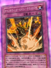 | Japanese | サイバネティック・ヒドゥン・テクノロジー | 自分フィールド上の「サイバー」と名のつく機械族モンスター1体を墓地に送り、相手の攻撃モンスター1体を破壊する。この効果を使用したターンのバトルフェイズを終了する。このカードと自分フィールド上の「サイバー」と名のつく機械族モンスター1体を墓地に送る。相手フィールド上のモンスター1体を破壊する。 |
