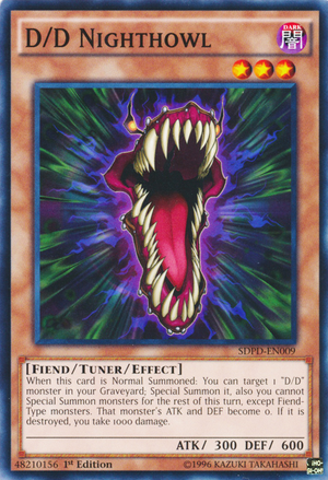 Quando este card for Invocado por Invocação-Normal: você pode escolher 1 monstro "D/D" no seu Cemitério; Invoque-o por Invocação-Especial e, além disso, você não pode Invocar monstros por Invocação-Especial pelo resto deste turno, exceto monstros do Tipo Demônio. O ATK e DEF desse monstro se tornam 0. Se ele for destruído, você sofre 1000 de dano.
