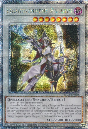 1 Empfänger + 1+ Nicht-Empfänger-Monster Falls diese Karte als Synchrobeschwörung beschworen und dafür ein „Magier“-Pendelmonster als Material verwendet wird: Du kannst 1 Zauber in deinem Friedhof wählen; füge ihn deiner Hand hinzu. Du kannst diesen Effekt von „Erleuchtungspaladin“ nur einmal pro Spielzug verwenden. Wenn diese Karte ein Monster eines Gegners durch Kampf zerstört: Du kannst deinem Gegner Schaden in Höhe der Grund-ATK jenes Monsters zufügen. |