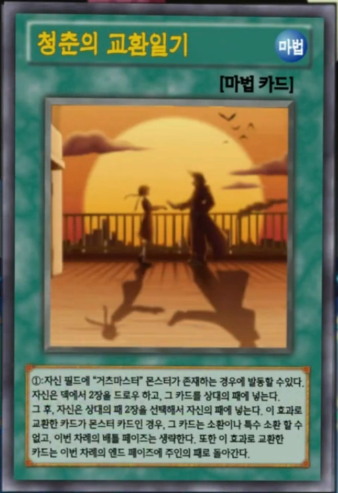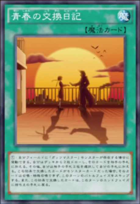 | Korean | 청춘의 교환일기 | ①:자신 필드에 "거츠마스터" 몬스터가 존재하는 경우에 발동할 수있다. 자신은 덱에서 2장을 드로우 하고, 그 카드를 상대의 패에 넣는다. 그 후, 자신은 상대의 패 2장을 선택해거 자신의 패에 넣는다. 이 효과로 교환한 카드가 몬스터 카드인 경우, 그 카드는 소환이나 특수 소환 할 수 없고, 이번 차례의 배틀 페이즈는 생략한다. 또한 이 효과로 교환한 카드는 이번 차례의 엔드 페이즈에 주인의 패로 돌아간다. |