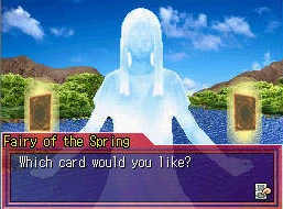 Fairy of the Spring appears in the video game Yu-Gi-Oh! World Championship 2008. When the player found a ripple in the spring, it will ask the player if the player wants to toss 100 DP into the spring. If the player does this, the player encourages Fairy of the Spring and she will ask the player which card would the player like. The player has two choices, which are L and R. If the player chooses the correct card, the player will receive a Equip Spell Card and if the player chooses the wrong card, it will tell the player that the spring spirit was just an illusion. Also, it will tell the player that their DP is lost in the water.