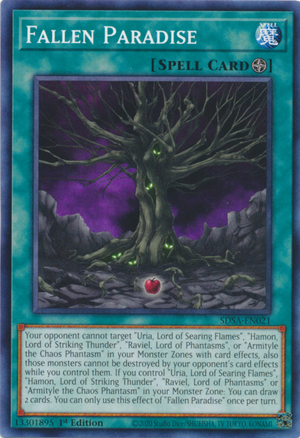 Your opponent cannot target "Uria, Lord of Searing Flames", "Hamon, Lord of Striking Thunder", "Raviel, Lord of Phantasms", or "Armityle the Chaos Phantasm" in your Monster Zones with card effects, also those monsters cannot be destroyed by your opponent's card effects while you control them. If you control "Uria, Lord of Searing Flames", "Hamon, Lord of Striking Thunder", "Raviel, Lord of Phantasms" or "Armityle the Chaos Phantasm" in your Monster Zone: You can draw 2 cards. You can only use this effect of "Fallen Paradise" once per turn. |